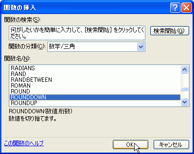 - 「ROUNDDOWN」関数を選択