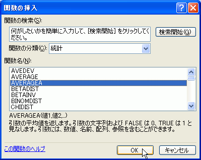 - 統計関数の中から「AVERAGEA」を選択して[OK]ボタンをクリック