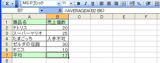 AVERAGE関数は、文字列を無視して数値データ部分に対する平均を求めますが、文字列を0とみなして、文字列データも含めて平均を求めるにはAVERAGEA関数を利用します。