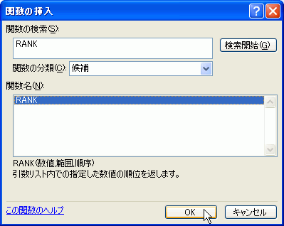 - 「RANK」関数を呼び出して[OK]ボタンをクリック
