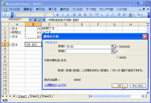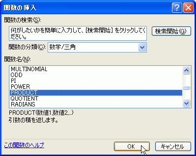 - 数学/三角関数のなかから「PRODUCT」を選択して[OK]ボタンをクリック