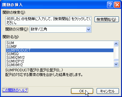 - 数学/三角関数のなかから「SUMPRODUCT」を選択して[OK]ボタンをクリック