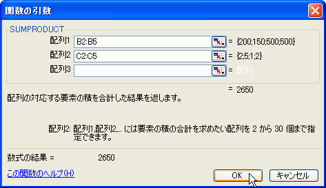 =SUMPRODUCT(配列1,配列2,配列3,...)