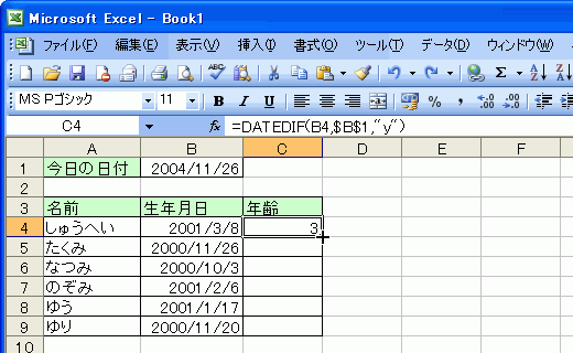 =DATEDIF(生年月日,今日の日付,"y")