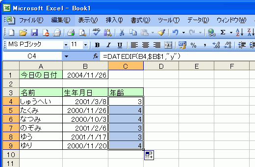 - 数式コピーすることにより、全員の年齢が求められました。