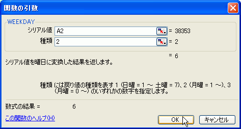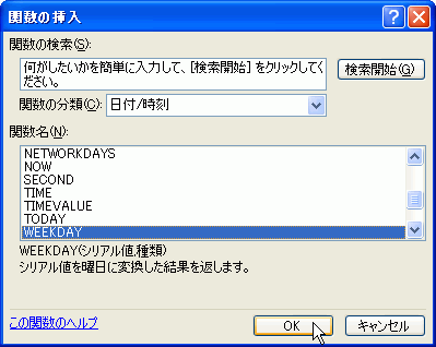 - [関数の挿入]ダイアログボックスの[日付/時刻]関数のなかから「WEEKDAY」を検索して[OK]ボタンをクリックします。