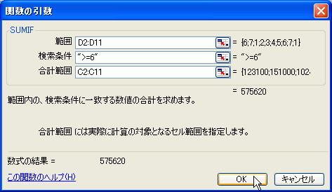 - [合計範囲]には、ここでは売上の金額のセル範囲を選択して[OK]ボタンをクリックします。