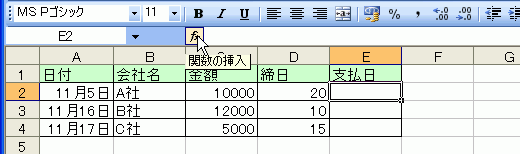 | 1 | 日付 | 会社名 | 金額 | 締日 | 支払日 |