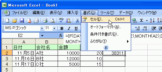 - シリアル値が返されたら、表示形式を日付に変更します。[書式]-[セル]を選択