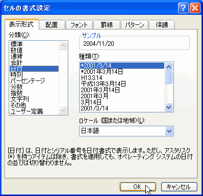 セルの書式設定ダイアログにて「日付」の表示形式にして[OK]ボタンをクリック