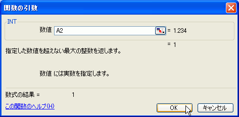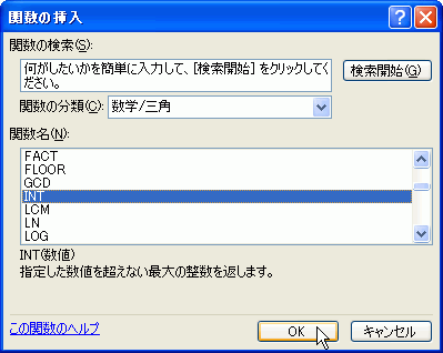 - 数学/三角関数の中からINT関数を選択して[OK]ボタンをクリック