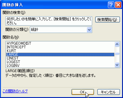 - 統計関数のなかから「LARGE」を選択して[OK]ボタンをクリック