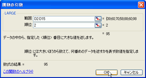 - [順位]には、大きいほうから数えて、何番目のデータを返すかをあらわす数値を指定する(ここでは「2」)