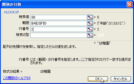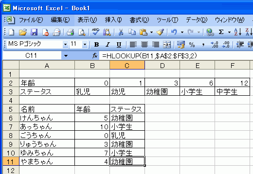 =HLOOKUP(検索値,範囲,行番号,検索の型)ここでは例として、年齢からステータスを求める方法を紹介します。