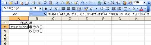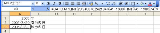 祝日法では、国立天文台の観測に基づき、前年の2月に官報による告示により決定されてはじめて春分の日と秋分の日が正式に決まりますが、INT関数を使って暫定的に求めることができます。