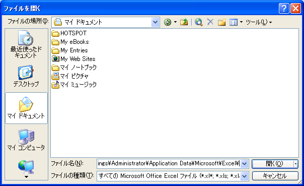 Windows XPでのユーザーごとのExcelのアプリケーションデータの場所は以下のパス(アドレス)でもOKです。