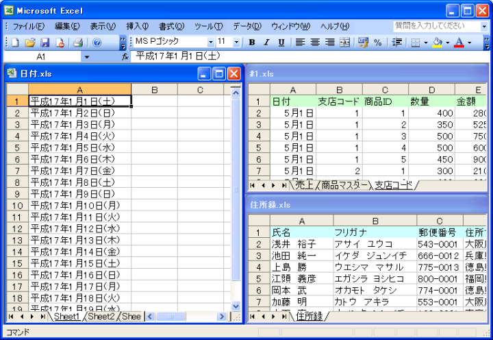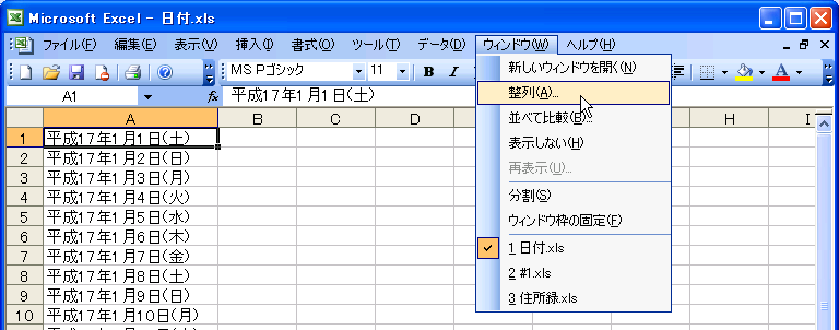 複数のブックを同時に開いている場合、それらを並べて表示したい場合はウィンドウの整列機能を使って並べて表示します。
