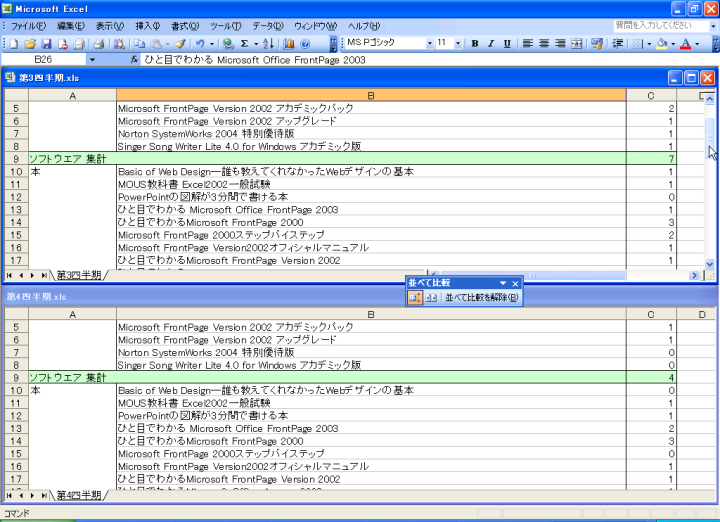 例えば、過去のデータファイルと比較したい場合、Excel 2003では[並べて比較]機能を利用して、二つのブックを同時にスクロールされ、簡単に比較することができます。