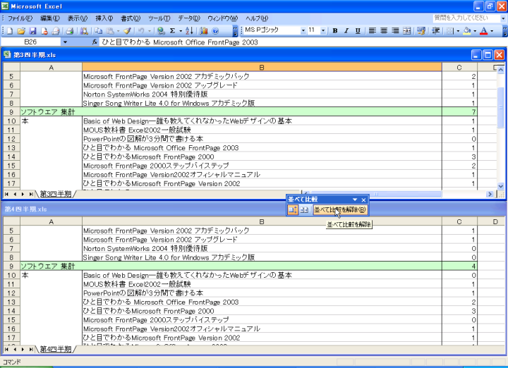 - [ウィンドウ]メニューの[(もう一方のファイル)と並べて比較]をクリックします(ここでは[第4四半期と並べて比較])