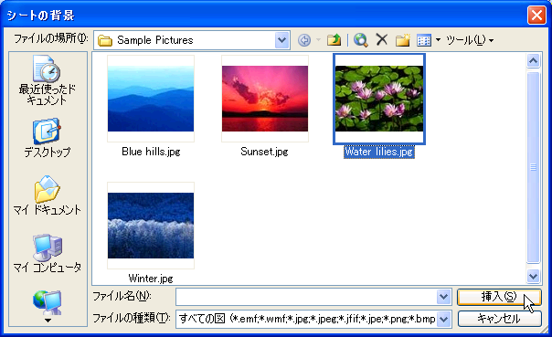 - [シートの背景]ダイアログボックスが表示されるので、背景画像を選択します。