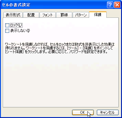 - [保護]タブをクリックし、「ロック」のチェックをはずします。