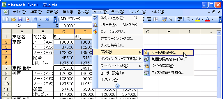 - [ツール]メニューの[保護]をポイントし、[シートの保護]をクリックします