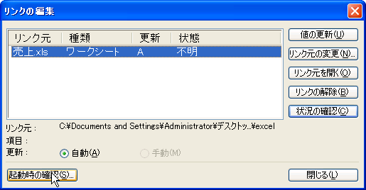 - [リンクの編集]ダイアログボックスの[起動時の確認]をクリックします
