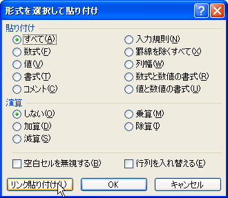 - [形式を選択して貼り付け]ダイアログボックスの[リンク貼り付け]ボタンをクリックします