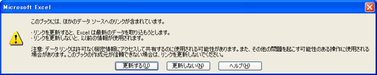 リンク先のファイルを単独で開くと "このブックには、ほかのデータ ソースへのリンクが含まれています。" というメッセージが表示されます。