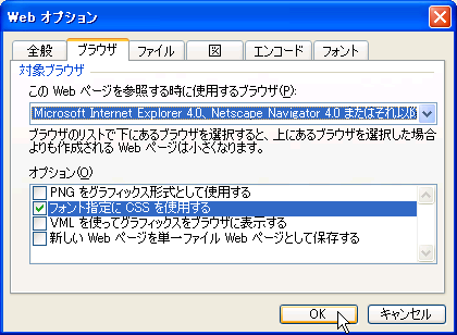 Internet ExplorerとNetscape Navigator両方のブラウザ互換のWebページを作成したい場合、WebオプションにてそのWebページを参照する時に使用するブラウザを「Microsoft Internet Explorer 4.0、Netscape Navigator 4.0またはそれ以降」に設定します。