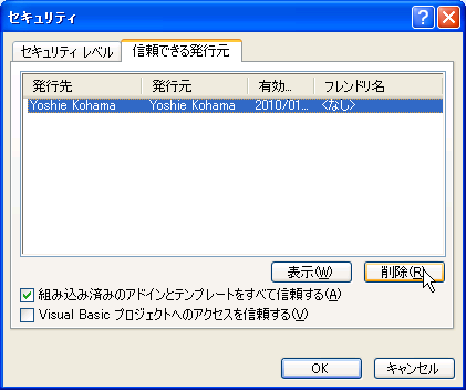 信頼できる発行元のリストのエントリを削除したい場合、以下の操作を行います。
