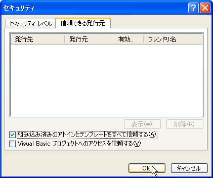 - マクロが含まれているブックファイルを開いたときにマクロに関する警告が表示されない