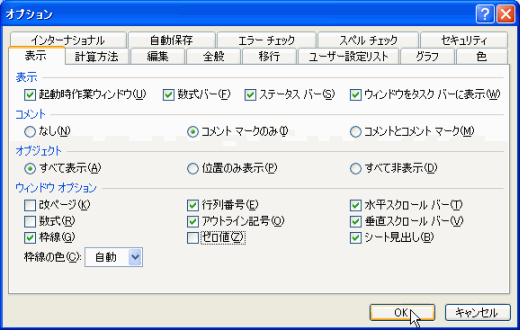 - [オプション]ダイアログボックスの[表示]タブを開く