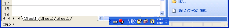 Excel起動直後にはステータスバーに「コマンド」と表示されています。