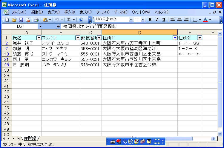 また、オートフィルタ実行後は、検索結果がステータスバーに表示されます。