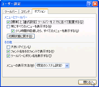 - 「[標準]と[書式設定]ツールバーを2行に並べて配置する」にチェックを付けます