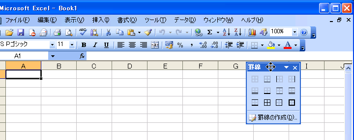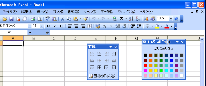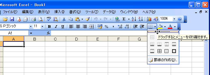 書式設定ツールバーの一部のメニューボタンからメニューを切り離すことができます。メニューを切り離すことができるツールボタンは「罫線」、「塗りつぶしの色」、「フォントの色」の3つで、それぞれ右側の▼をクリックして表示されるメニューを切り離し、パレット感覚で使用することができます。