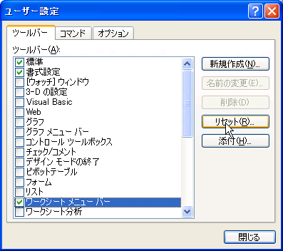 ワークシートメニューバーをリセットすることにより、初期設定に戻すことができます。