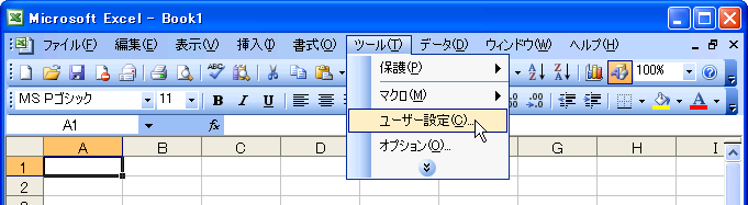 - [ツール]メニューの[ユーザー設定]をクリックします。