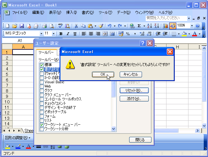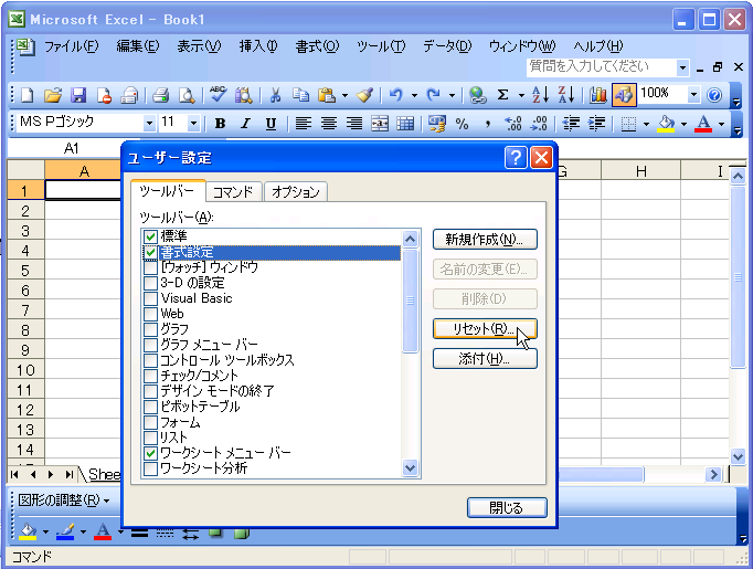 何か特定のツールバーを既定値に戻したい場合、ユーザー設定ダイアログボックスを表示し、リセットしたいツールバーを選択して地セットを行います。