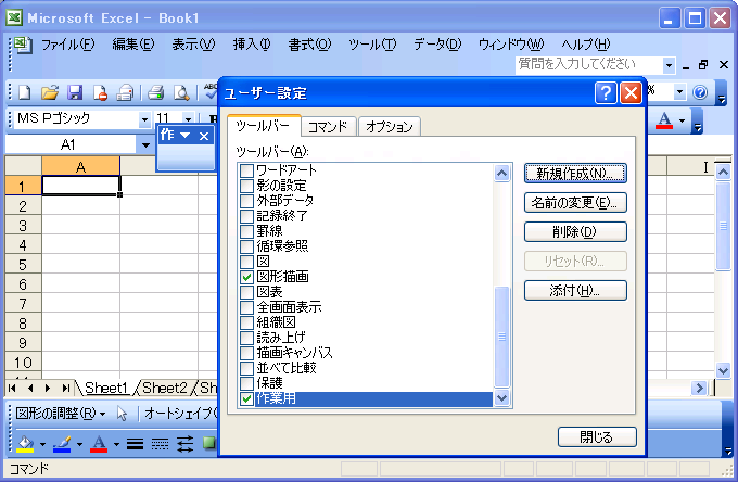 - [ユーザー設定]ダイアログボックスの[ツールバー]タブをクリックして[新規作成]をクリックします