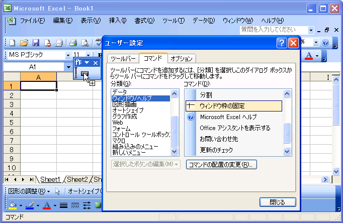 - ここでは例として[ウィンドウの固定]ボタンを新しく作成されたツールバーに追加します