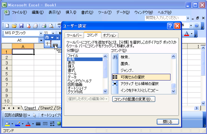 - 他にボタンを追加したい場合は、同様に新規ツールバー内までドラッグします