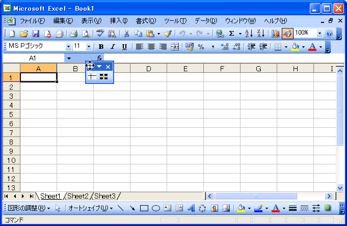 - 新規ツールバーをツールバーエリアに納めたい場合は、ツールバーのタイトルバー(青い部分)にマウスポインタを重ね、移動したい場所までドラッグします。