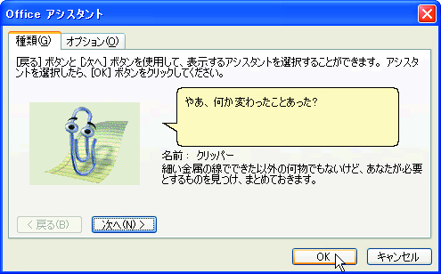 ここでは、Officeアシスタントを非表示にする方法、および、Officeアシスタントを変更する方法について説明します。