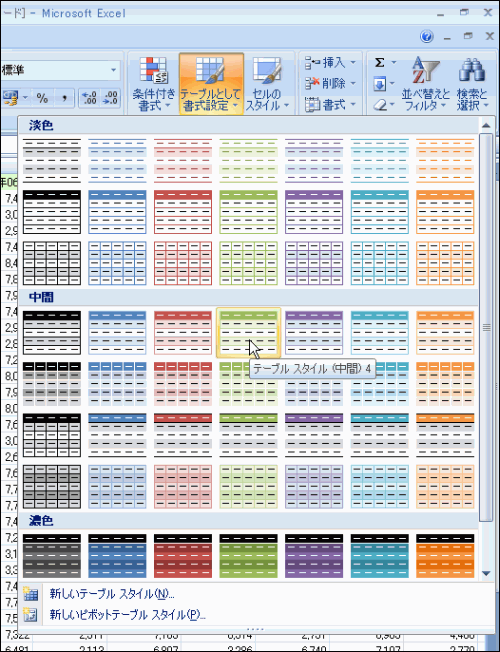 Excel 2007では、「テーブルとして書式設定」機能が搭載され、これで素早く美しい表が作成できます。