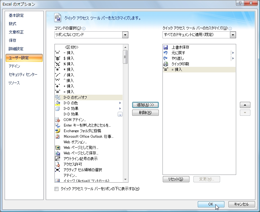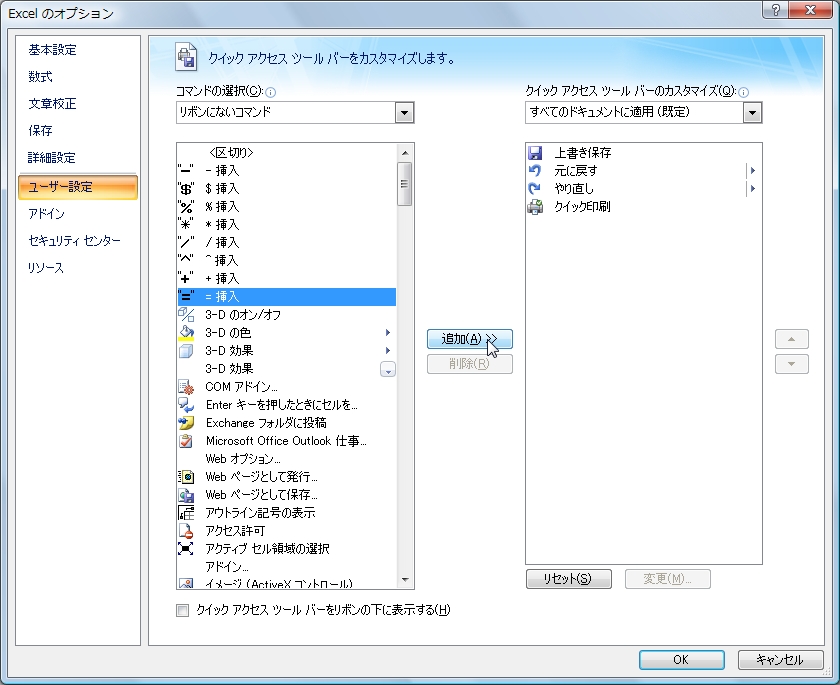 そこで、Excel 2007のクイックアクセスツールバーに「=」ボタンを登録する手順を紹介します。