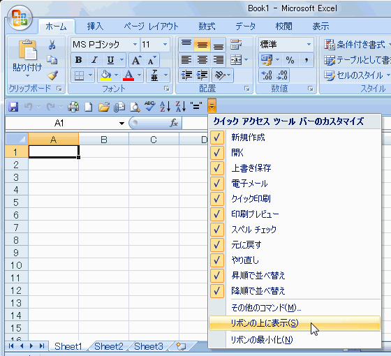 リボンの下に移動されたクイックアクセスツールバーをもとの場所に戻すには、下の図のように[リボンの上に表示]を選択します。