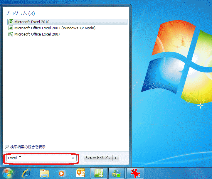 - [プログラムとファイルの検索]ボックスに「Excel」と入力してEnterキーを押します。