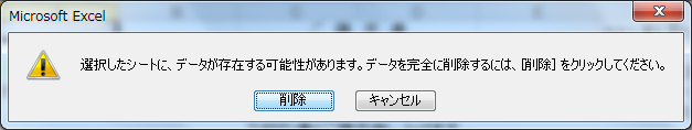 - [選択したシートに、データが存在する可能性があります。データを完全に削除するには[削除]をクリックしてください。]というメッセージが表示されます。本当に削除する場合は[削除]ボタンをクリックします。